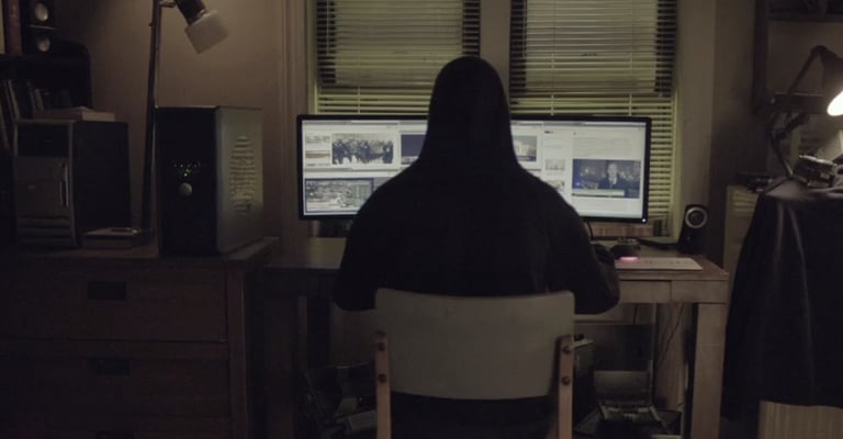 Les scènes techniques ou informatiques sont souvent tournées dans des espaces sans caractère. Ici, l'éclairage se réduit au strict minimum : la lueur d'un écran ou une source unique isolée. Le reste de la pièce étant plongé dans l'ombre, l'absence de décor devient un atout. L'attention est forcée sur le sujet.
